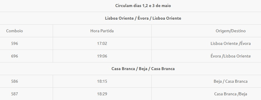 Assim, a partir do próximo dia 4 de maio a CP – Comboios de Portugal restabelece na íntegra os seus horários para os comboios Regionais, InterRegionais e Urbanos de Lisboa, Porto e Coimbra. Por outro lado, os comboios Alfa Pendular e Intercidades continuam com a atual oferta em vigor desde o dia 14 de abril, ao passo que os comboios Internacionais Sud-Expresso, Lusitânia-Comboio Hotel e Celta mantêm-se suspensos em todo o seu trajeto.